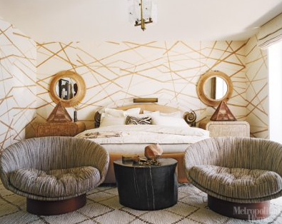 Finally, I would be terribly remiss if I didn’t mention the super fab ‘70s decor featured in the film. Everything is warm and wood paneled with smoked glass and bronze and gold accents supplying the glam. Suddenly, my own mid-century modern house and furniture feels a little too predictable and well-behaved. It could use a little something over-the-top and, dare I say, tacky. But you know, good-tacky…like metallic wallpaper. I would say this movie is going to set off a return to ‘70s rustic-mod style in interior design if design megastar Kelly Wearstler hadn’t already been doing this for years. Take a look at the images here to play a little game of “‘American Hustle’ set or Kelly Wearstler design?” It’s not as easy as you’d think.